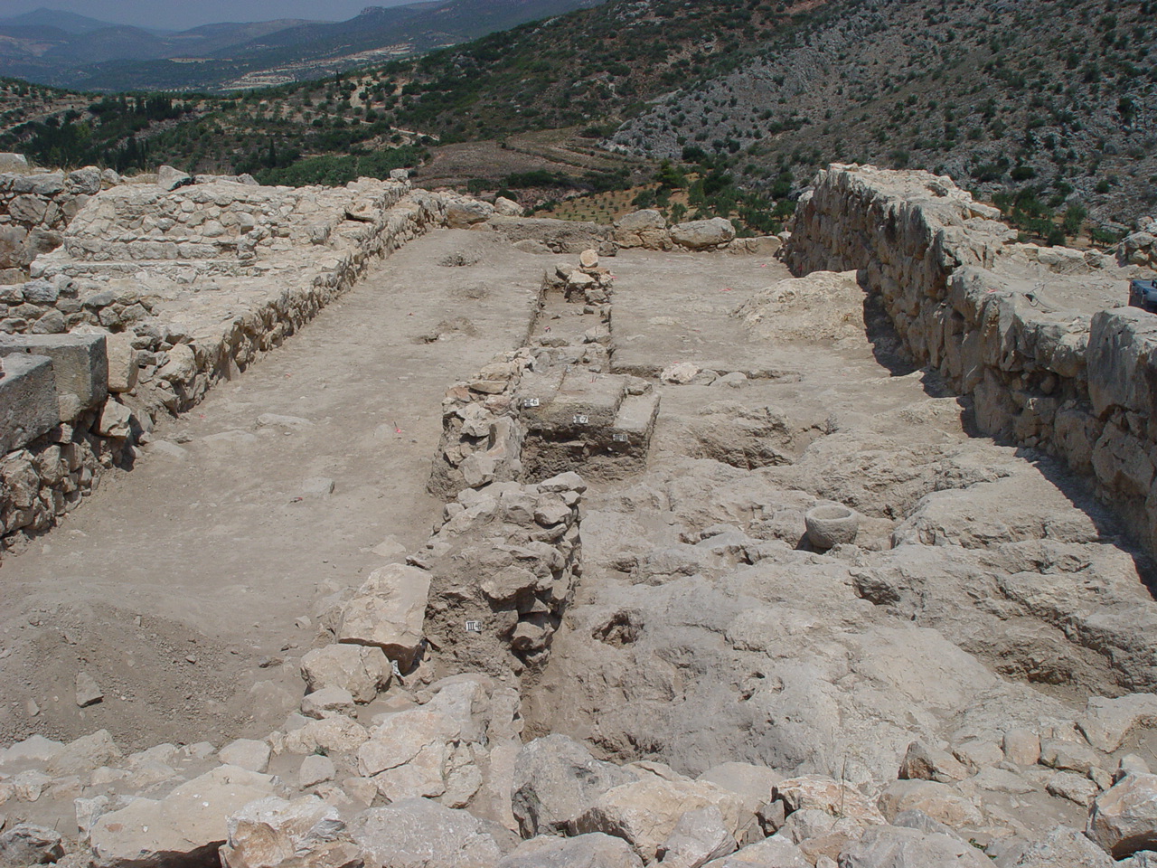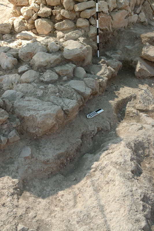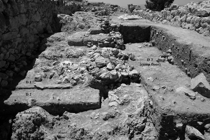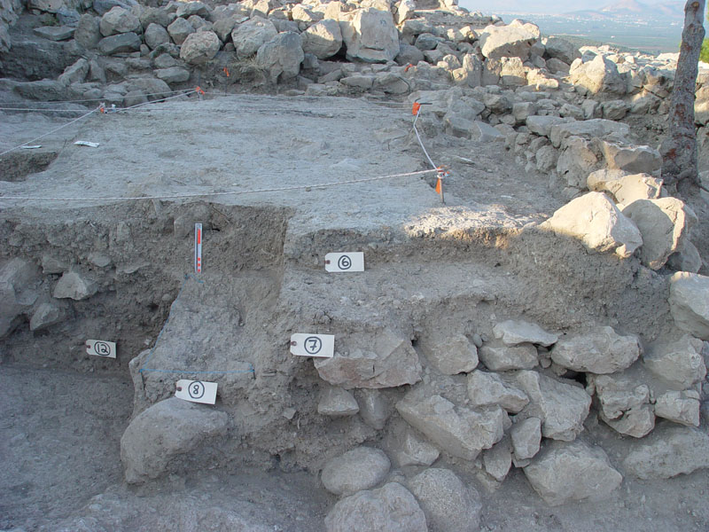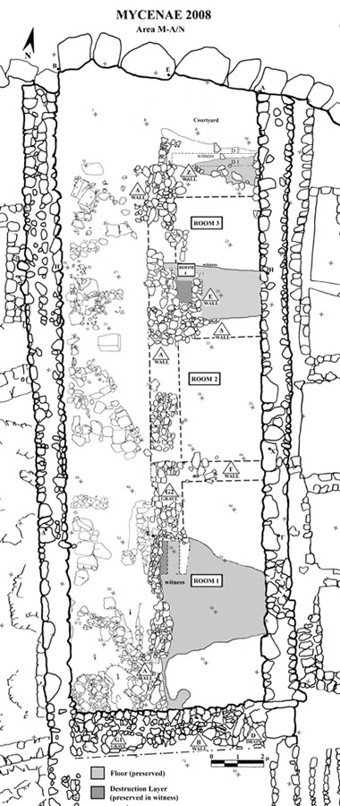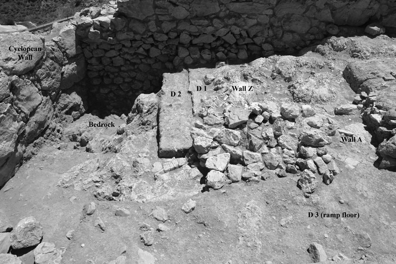 In the northern sector (Sector I), by the North Cyclopean wall, the mixed surface fill was cleared off to reveal the remains of the northernmost room of Building K. Room 3 (5.40m x 4.2m) terminates at the thick (1.60–1.75m) northern exterior wall of the building (Wall Z) which runs E-W between the long western exterior wall of the building (Wall A) and the western exterior wall of Storerooms Λ, at a distance of approximately 3m from the Cyclopean wall. The area between Wall Z and the North Cyclopean wall appears to have been a small open-air courtyard with earthen floor, covered by the stone pile debris of Wall Z which has apparently collapsed downhill to the north. Room 3 must have been entered from the north, through this open-air courtyard. A partially preserved floor, made of pressed earth and clay (0.20-0.35m thick) stretches between the two parallel exterior walls in Room 3, bearing clear traces of fire and covered with a thick destruction fill which produced LH IIIB2 pottery and contained well-preserved remains of collapsed mud-brick superstructure encased in wooden framework. The clay floor was laid upon a leveling course of slabs which sealed off an undisturbed thick foundation fill. The foundation fill contained small and medium-size field stones placed to fill the cavities of the bedrock outcrops and level off the ground. The stone sockle of Wall A (0.60m thick) was founded directly upon a low and wide (1.60m) rubble platform which runs parallel to the wall and projects inward by approximately 1m, underneath the edge of the clay floor and its foundation fill. The western part of Room 3 is cut off by means of a corner partition wall (Wall E) and turned into a narrow blind room (Room 4: 2.30m x 1.30m) entered from the north, most probably a low staircase leading up to Room 2 whose floor is raised by 0.50-0.60 m.