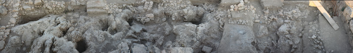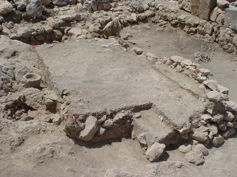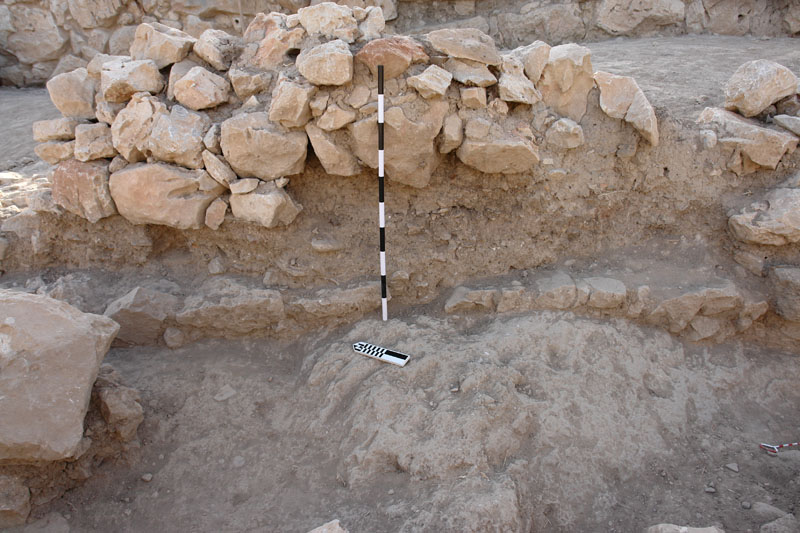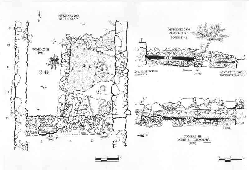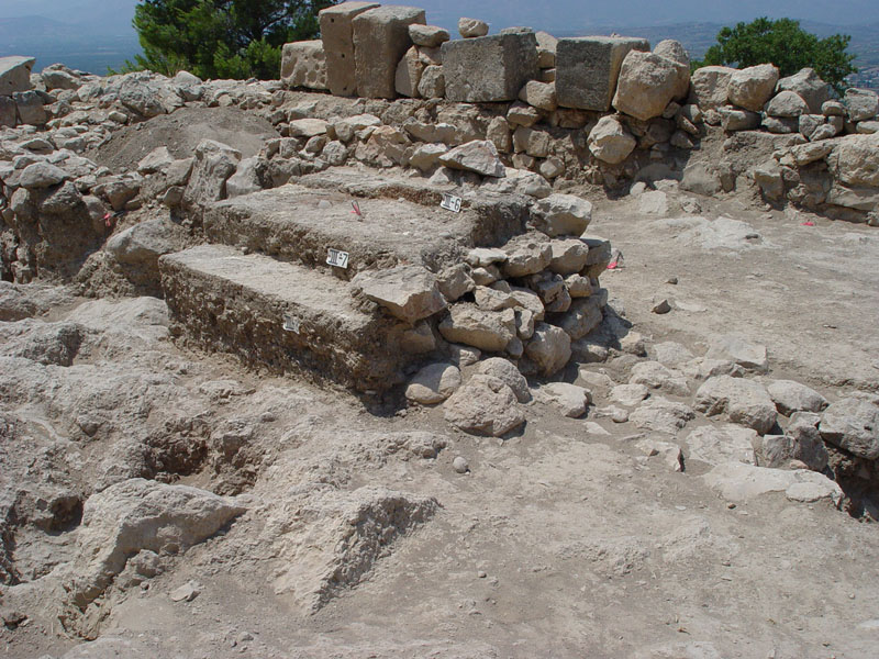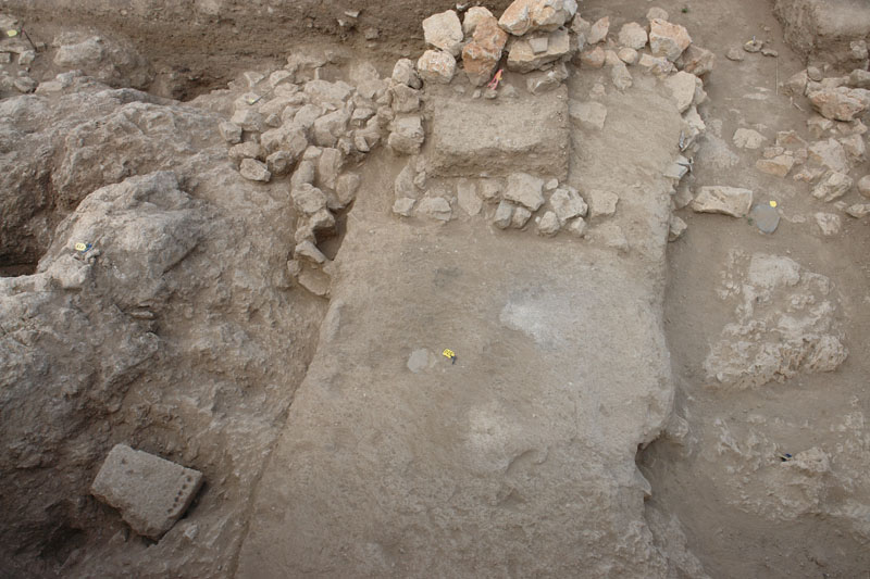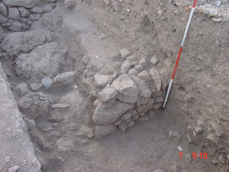 In the northern sector (Sector I), by the North Cyclopean wall, the mixed surface fill was cleared off to reveal the remains of the northernmost room of Building K. Room 3 (5.40m x 4.2m) terminates at the thick (1.60–1.75m) northern exterior wall of the building (Wall Z) which runs E-W between the long western exterior wall of the building (Wall A) and the western exterior wall of Storerooms Λ, at a distance of approximately 3m from the Cyclopean wall. The area between Wall Z and the North Cyclopean wall appears to have been a small open-air courtyard with earthen floor, covered by the stone pile debris of Wall Z which has apparently collapsed downhill to the north. Room 3 must have been entered from the north, through this open-air courtyard. A partially preserved floor, made of pressed earth and clay (0.20-0.35m thick) stretches between the two parallel exterior walls in Room 3, bearing clear traces of fire and covered with a thick destruction fill which produced LH IIIB2 pottery and contained well-preserved remains of collapsed mud-brick superstructure encased in wooden framework. The clay floor was laid upon a leveling course of slabs which sealed off an undisturbed thick foundation fill. The foundation fill contained small and medium-size field stones placed to fill the cavities of the bedrock outcrops and level off the ground. The stone sockle of Wall A (0.60m thick) was founded directly upon a low and wide (1.60m) rubble platform which runs parallel to the wall and projects inward by approximately 1m, underneath the edge of the clay floor and its foundation fill. The western part of Room 3 is cut off by means of a corner partition wall (Wall E) and turned into a narrow blind room (Room 4: 2.30m x 1.30m) entered from the north, most probably a low staircase leading up to Room 2 whose floor is raised by 0.50-0.60 m.