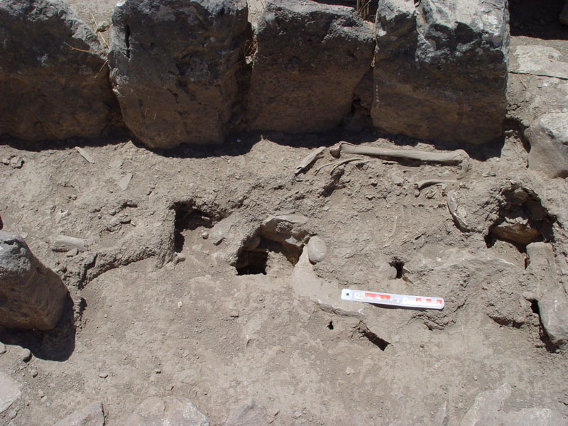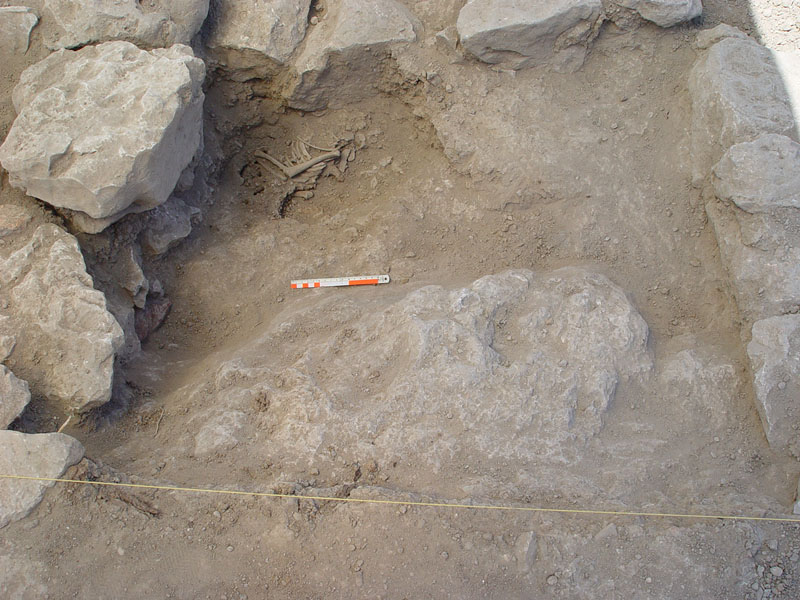 Beneath and encased by the foundation platform of the western exterior wall were found two adjacent shallow bedrock cavities, on either side of cross-wall Γ, both sealed off by an overlaying Mycenaean pottery deposit: the southern cavity (1.10m x 0.80m) contained a MH burial which was furnished with an obsidian core, two stone scrapers, matt-painted and Minyan pottery, and the skeleton of a small animal, apparently the remains of a funerary ritual offering or animal sacrifice; the northern cavity (0.40m x 0.80m) was filled with a thick layer of ash and burnt soil containing burnt wood and sherds, most likely remains of a funerary pyre associated with the adjacent MH burial.