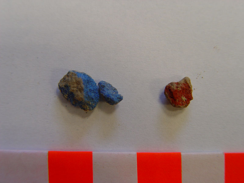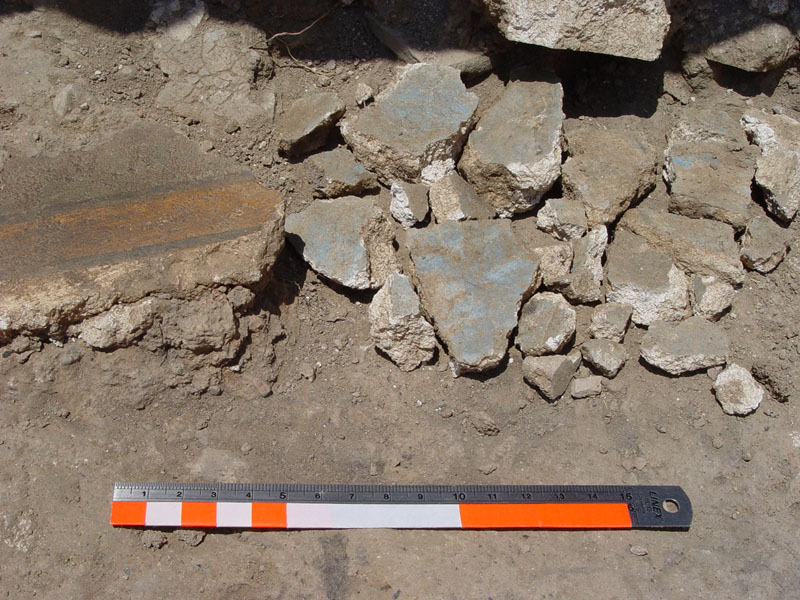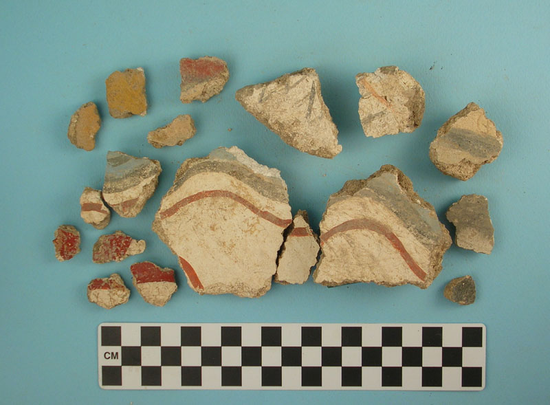 Embedded in the 20cm-thick clay floor layer were found small fresco fragments, parts of Mycenaean figurines, obsidian flakes, Mycenaean 'buttons' (cloth eights), color pigments, shell, animal bones, and diagnostic LH IIIA2/B1 sherds which provide a t.p.q. for the construction of the floor. The underlying foundation fill produced mixed MH-LH IIIA2/B1 pottery and a heterogeneous assemblage of various finds, apparently coming from earlier disturbed layers and debris brought from other destroyed buildings nearby and dumped there, mixed with rubble and filled with brought soil to form the foundation of the new building. The foundation fill contained, among other finds, a great number of fresco fragments decorated with blue, red, and yellow color bands and tri-curved patterns, remains of burnt wooden beams, obsidian blades, cores and flakes, stone tools and vases, Mycenaean figurines and beads, color pigments, shell and animal bones. A LH pottery deposit was located in the foundation of the western wall of the room; furthermore, the excavation of two deep bedrock cavities under the foundation fill revealed a clear stratification of successive undisturbed layers of earlier periods (LH I/II, MH, Neolithic).