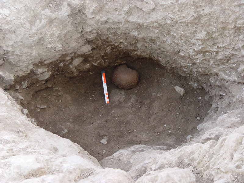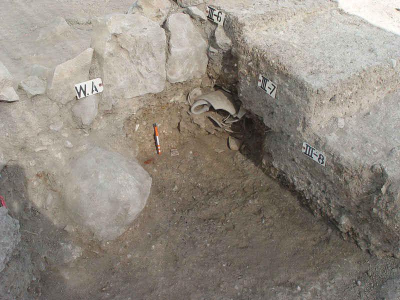 To the west of Wall A and at a depth of –2.60m (approx. 0.50m deeper than the floor level of Room III) another pressed earth floor was unearthed, which appeared to be a road pavement rather than a room floor, most likely an access road to the northern Cyclopean Wall and to the small courtyard.