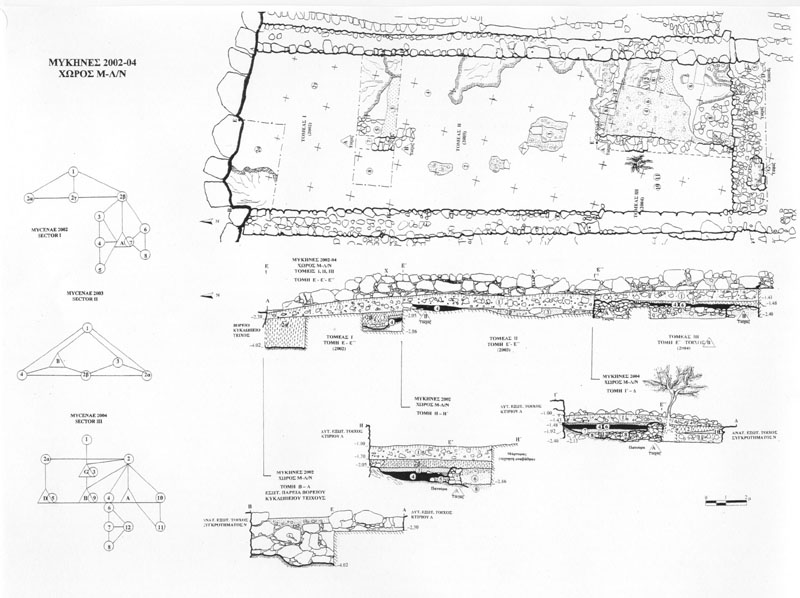 The 2002-2008 excavation campaigns focused on the northwestern part of the citadel in the area between the complex of Building N and the Storerooms Λ of Megaron M, just to the NE of the Lion Gate; this oblong area (approx. 26m x 7.5m) was divided in three sectors and was overlaid with a 2x2m grid (established by means of a Total Station and Differential GPS). A Late Mycenaean building was discovered therein (Building K), which was a single-story, oblong structure (approx. 26m x 4m) attached to the Storerooms Λ of Megaron M, opening to the north onto a small (3.5m x 5m) open-air courtyard and to the west onto a wide ramp which gave access to the North Cyclopean wall and the adjacent courtyard. Building K was divided internally by partition cross-walls into a row of three rooms (storerooms and a kitchen area, as indicated by the associated finds and the soil micromorphology) with floors at different terrace levels following the descending slope to the north, and a low staircase connecting the two northernmost rooms. The clay floor of the building, which sealed a deep foundation fill (LH IIIA2/B1), was found covered with a thick ash destruction layer (final LH IIIB2). The successive and superimposed, eroded earthen floors of the open-air courtyard were laid upon a foundation fill which sealed off an underlying deep rubble fill of loose rocks and chips produced from the foundation and construction of the North Cyclopean wall (LH IIIA2). Building K appears to have been a rather temporary extension or addition to the Storerooms Λ of Megaron M: it was built on the foundation platform of an earlier phase apparently in a hasty, careless fashion and with re-use of earlier building material soon after the first destruction horizon (early LH IIIB2), at a time when the nearby palatial storerooms lay badly damaged and storage space was desperately needed until their full repair and restoration. Building K was totally destroyed at the very end of LH IIIB2, during the second destruction horizon, clearly by earthquake (to infer from the seismic imprint on the wavy outline of the long western wall) combined with a subsequent conflagration (as indicated by the thick ash destruction fill and abundant remains of burnt wood and sherds). This short-lived building was filled-in, never to be re-used again (as opposed to the adjacent Storerooms Λ and wall casemates of Megaron M), thus forming an important LH IIIB2 closed context sealing at places an undisturbed MH-LH IIIB stratigraphy.