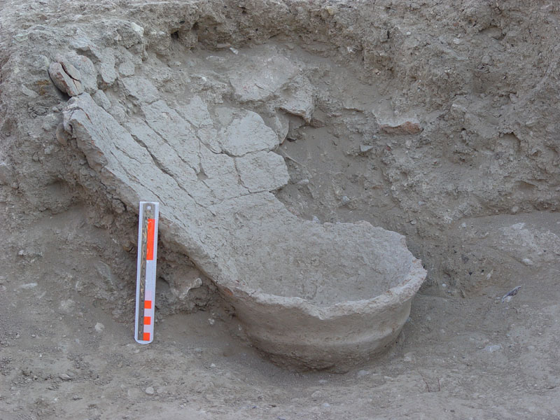 The excavation of the central sector of the area (Sector II) revealed traces of Tsountas' Π-shaped test trenches dug in the 1890s, which were carefully cleared off along with all mixed and disturbed deposits. The long western exterior wall (Wall A) of the building and its foundation platform were found covered at places by collapsed, melted and burnt mud-brick superstructure, rubble, and roof tiles. Room 2 (5.35m x 4.2m), which was also entered from the west, is defined by two fragmentary partition walls, cross-walls Γ and Δ, dividing it from Room 1 to the south and from the adjacent Room 3 to the north, respectively. A partially preserved undisturbed destruction fill was associated with this room, and a large jar was found in situ in the context of this destruction fill, still containing organic remains (wine residue). Small finds from this sector included many zoomorphic and anthropomorphic Mycenaean figurines; a Mycenaean bead of blue-mass and stone 'buttons'; a marble finial of a sword-hilt or scepter; obsidian blades and core fragments; metal objects (including two ancient pottery repair clamps still attached to potsherds); stone grinders; a large number of clay loom-weights; fresco fragments; color pigment; a slab bearing an engraved mason's mark and samples of waterproof bonding lime plaster (plesia); a Hellenistic coin; shell, burnt and unburned animal bones; roof tiles and large quantities of pottery, mainly of the LH IIIB period.