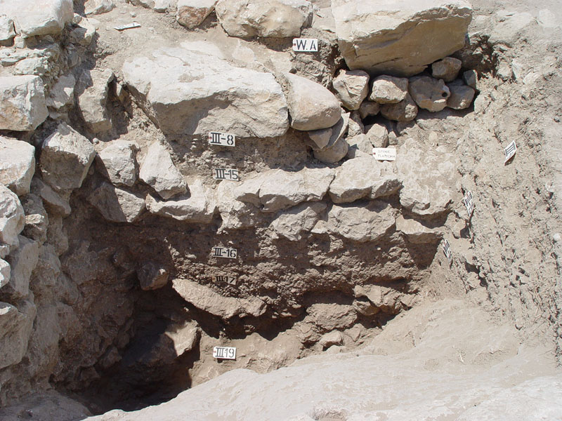 A small (3.5m x 5m) open-air courtyard extended between the northern end of Building K (Room 3) and the North Cyclopean wall. This courtyard gave access to Room 3 from the north and was approached via the wide ramp running alongside Building K. The successive and superimposed, eroded earthen floors of the open-air courtyard, which were covered by the stone pile debris of the northern exterior wall of Building K (Wall Z), were laid upon a foundation fill which sealed off an underlying deep rubble fill of loose rocks and chips produced from the foundation and construction of the North Cyclopean wall (LH IIIA2).