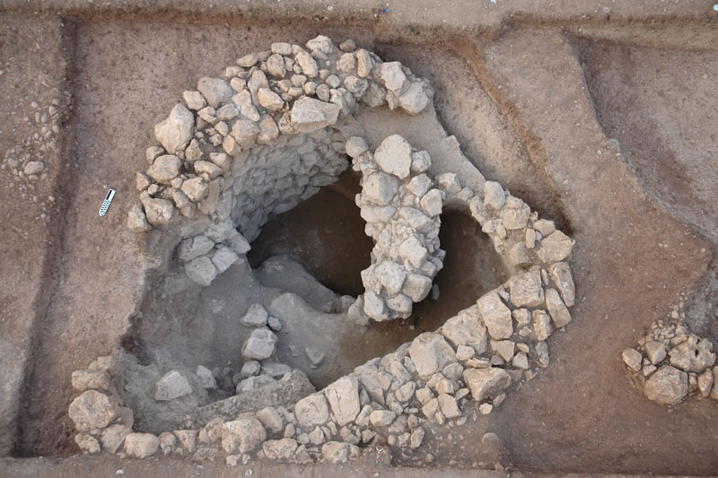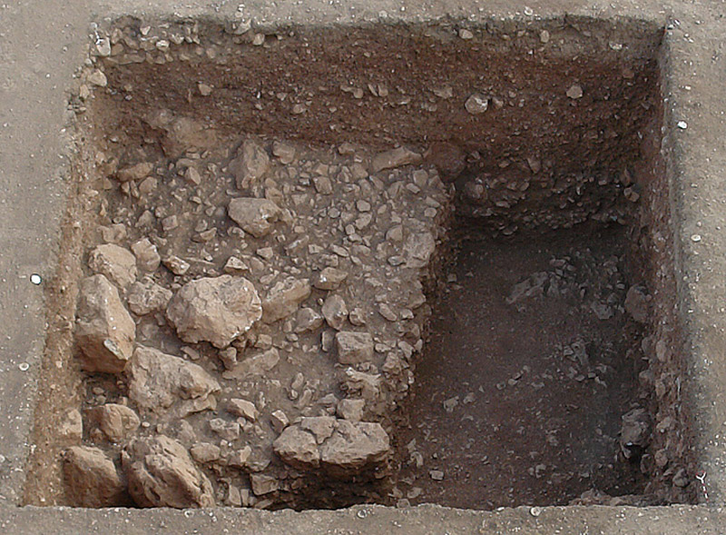 In the northwestern part of the SWB II terrace, precisely where the fluxgate gradiometer and the GPR had detected a fan-shaped feature (D4-XCVI Ι -21/22), a peculiar apsidal structure (3.20m x 4m) which progressively narrows and funnels downwards was discovered. Two architectural phases can be discerned in the construction of the structure which appears to have been originally circular and subsequently apsidal, as its northern half was severed and the structure was expanded northward with the addition of a straight wall with rounded ends and an entrance possibly on the northeast. The 0.75m-thick curved wall of the structure is built of two faces with medium-sized field stones and rubble core fill. The interior face of the curved wall tapers down to a depth of at least ten courses, whereas its exterior face was unearthed to a height of only three courses, for traces of a walking surface were detected around the curved wall on that level. The interior of the apsidal structure was covered with a thick destruction fill containing a rubble pile of fallen stones, melted mud-brick, ‘plesia' (insulating whitish mortar), floor slabs, and terracotta roof tiles. The destruction fill sealed an underlying thin pebble layer (floor?) which was laid upon a deep sandy silt fill containing very few finds so far, including a black-glazed single-handled miniature cup (kyathion). The pottery collected so far from the interior of the structure is predominantly Mycenaean, but also includes very few Middle Helladic sherds, Geometric and Archaic pottery, and a few red-glazed and black-glazed Hellenistic pottery sherds and fragments of roof tiles. The stratification and horizontal grading of the fill deposit from larger to finer material (medium-sized stones, small stones, pebbles, fine sandy/silt sediment) and the wet silt fill indicate presence of stagnant water and gradual sedimentation of material in the interior of the structure. The precise function, however, of the apsidal structure still remains elusive: formerly it was tentatively identified as a ceramic kiln on the basis of its apsidal ground-plan, its strong magnetic image, and the discovery of a few misfired sherds in the vicinity; the fill sedimentation, though, combined with the downward tapering and increasing depth of the structure rather seem to support a tentative identification of a cistern, bothros, or well.
