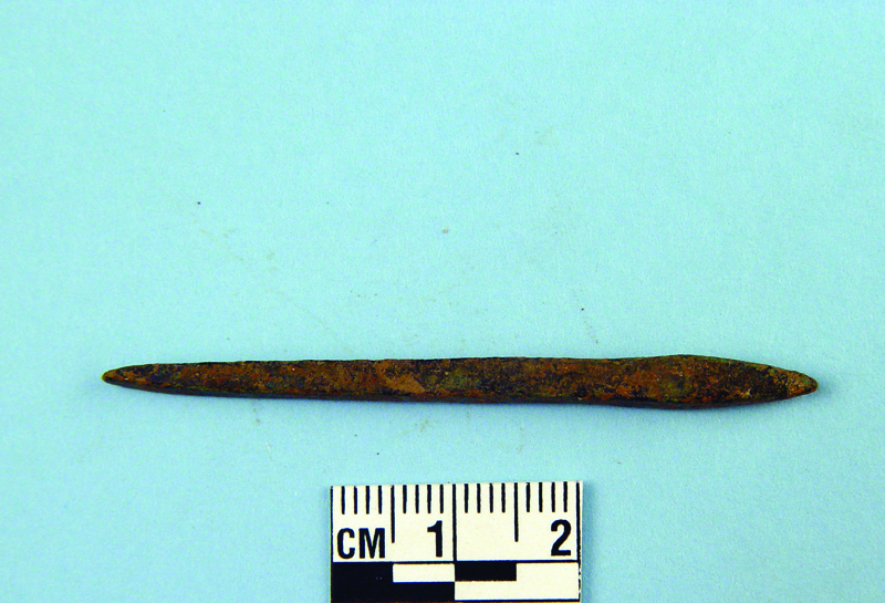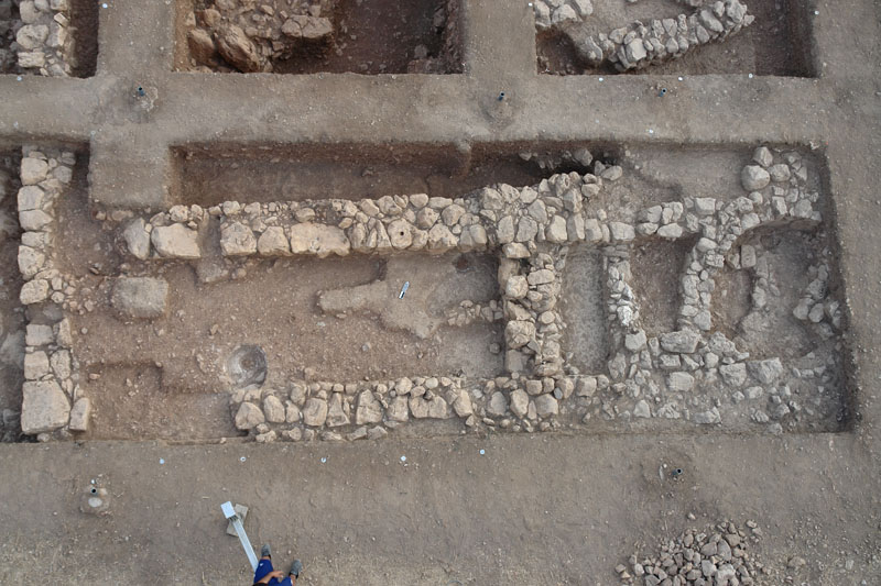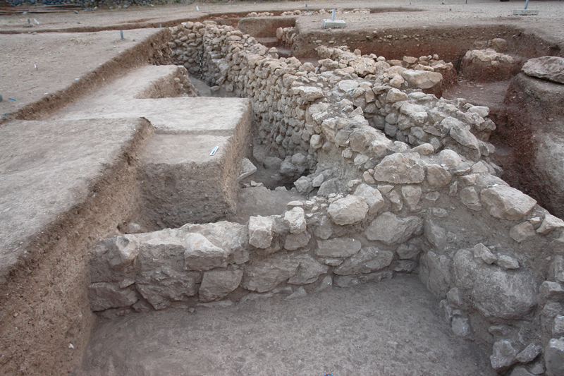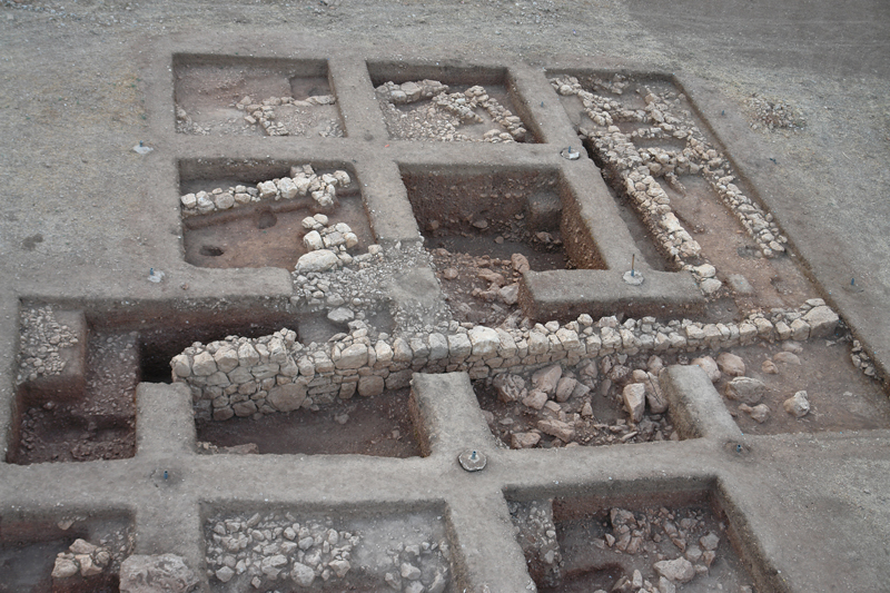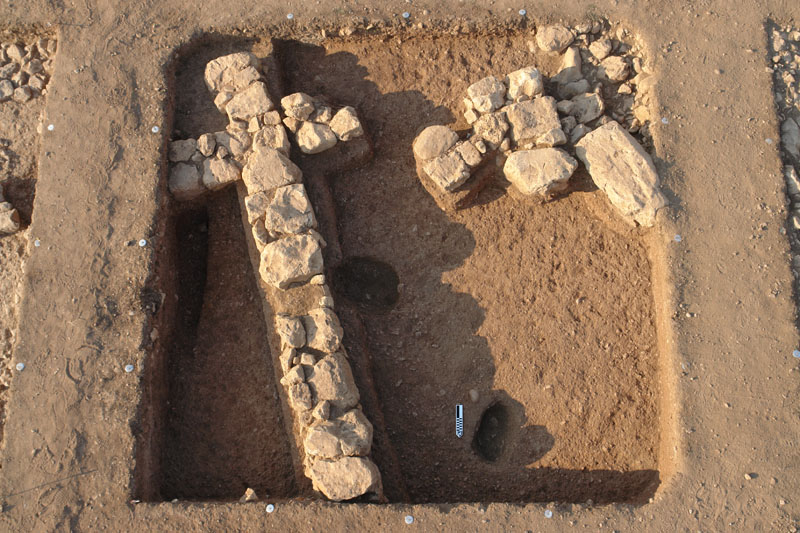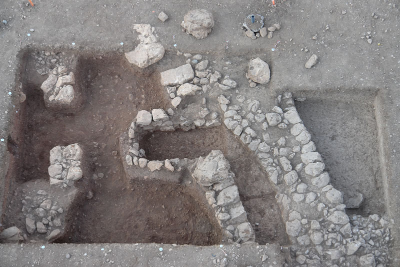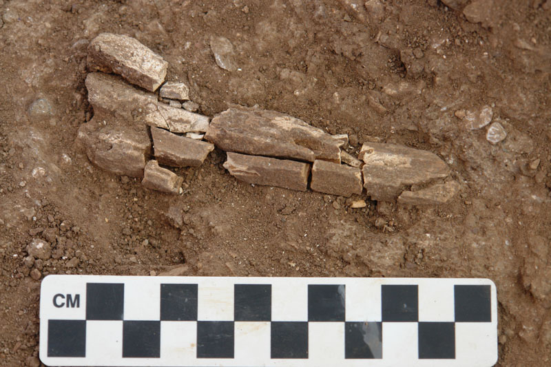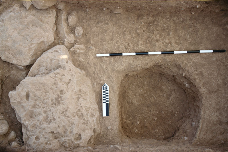 To the south of this complex was uncovered an adjacent oblong building which had been detected by the geophysical survey in the southern part of the targeted sector (D4-XCVII-73/74/75). The oblong building is delineated by two long parallel walls running E-W for some 10m at a distance of 1.8m from each other. The solid northern wall (0.50-0.70m) is built with boulders placed on its southern face and smaller field stones on its northern face, whereas the parallel southern wall is of rather simpler and thinner construction (0.35m), being possibly a later addition to the building. Both walls were founded on a fill and survive to the height of two or three courses. The two long parallel walls and a thick partition wall abutting them at right angles define two adjoining rooms. The western corridor-like room (int. dim. 5.5m×1.8m) preserves parts of the clay floor and a shallow circular work pit coated with lime plaster (D4-XCVII-73/74). Ivory objects and animal bones were found near the partition wall in the eastern end of the western room. The eastern room (D4-XCVII-75) was later divided by a thin partition wall into two small chambers with clay floors. The discovery of joining sherds of the same pithos in both chambers or embedded in the south wall indicate damages, successive repairs and spatial rearrangement of the building with the addition of the partition wall. Several small finds were retrieved from the eastern part of the building, including sling stones, stone tools, a zoomorphic figurine, sherds of a large pithos, cookware (clay fry pans), and animal bones. The eastern part of the building incorporated an earlier circular structure, as revealed by careful examination of wall joints: the northern wall of the building abuts on the circular structure, while the severed southern part of the structure abuts on the southern wall of the building (D4-XCVII-75). The function of the circular structure, however, remains elusive (water cistern or clay basin?); to this end, an intact block soil sample consolidated with resin was collected from the interior of the structure for soil micromorphology. Further excavation is required to define the precise use and chronology of the oblong building, which yielded Mycenaean, Geometric, but also Early Archaic (Corinthian) pottery, and to elucidate its obscure spatial relationship, if any, with the long Mycenaean wall.
