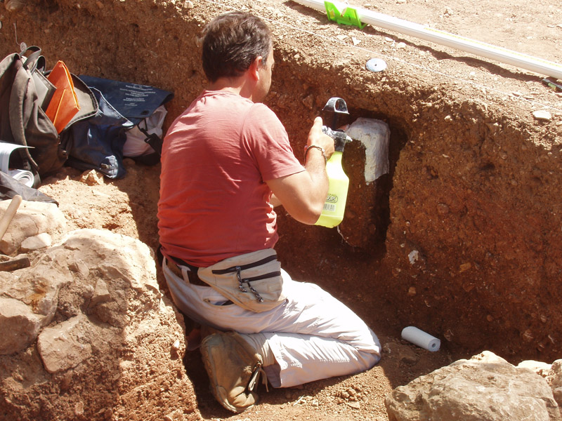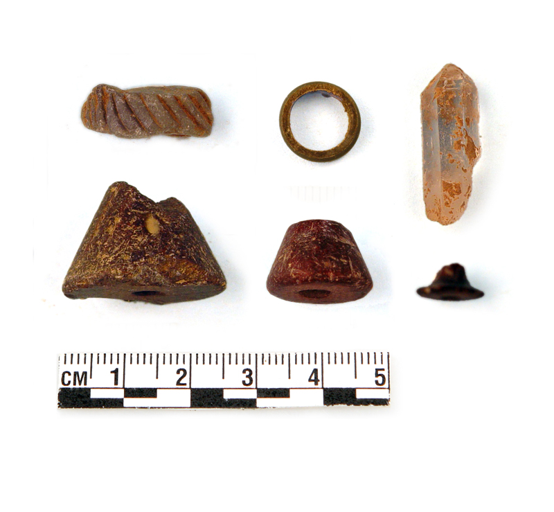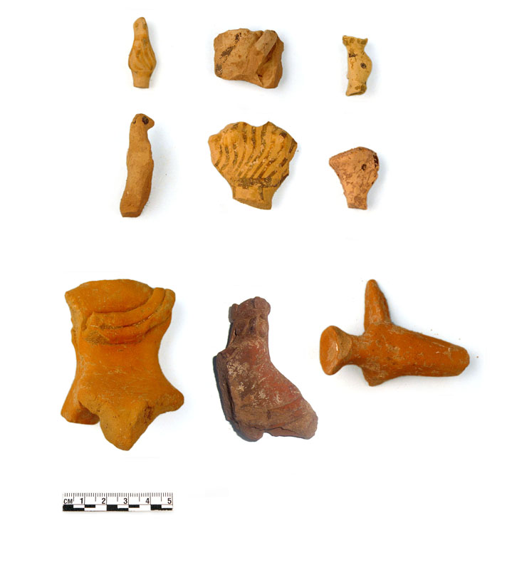 A great number and wide variety of finds were collected, including fragments of Mycenaean, Orientalizing and Archaic figurines; talisman pendants, jewelry (earrings, rings, pins), sealstones, and coins; ivory objects; fragments of stone vases and glass shards; arrowheads and sling stones; lead sheets and weights, lead repair clamps for pottery; flint and obsidian blades, flakes, and cores, grinders and stone tools; metallic objects and tools, iron nails and hooks, chisels and pointers; clay loom weights, spools, and clay stands; fresco and plaster fragments; color pigments, carbonized wood, animal bones, shell; roof tiles and abundant pottery (mainly Mycenaean, Geometric, and scarcely Geometric and Hellenistic). All excavated soil is sifted, and soil from uncontaminated closed contexts or undisturbed sealed layers is water-sieved (Flote-tech). Soil samples are systematically collected for soil micromorphology (intact block samples consolidated with resin) and archaeobotanical analysis (uncontaminated samples) which will hopefully contribute to a better understanding of the ancient landscape and its complex spatial organization. The preliminary study of the archaeobotanical material has identified remains of grape pips, olive stones, figs, cereal grains, barley, and pulses. The analysis of animal bones has identified a wide variety of domesticated animals (sheep, goats, cattle and pigs, dogs, donkey) and wild species (wild boar, deer, red deer , hare). All animals appear to be represented by all body parts, suggesting processing of complete carcasses on-site. Furthermore, human bones of newborn children were tentatively identified among the collected animal bones: these were found scattered in several contexts and are remains perhaps of disturbed children burials once interred under the floors or thresholds of houses which were eventually washed away by erosion. The preliminary examination of stone tools has generated interesting observations on manufacture techniques and use. Finally, the systematic classification and study of pottery is already underway (including collection of samples for thin-section petrographic and INAA analysis).