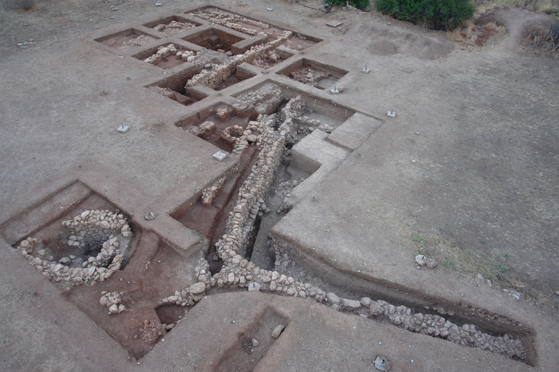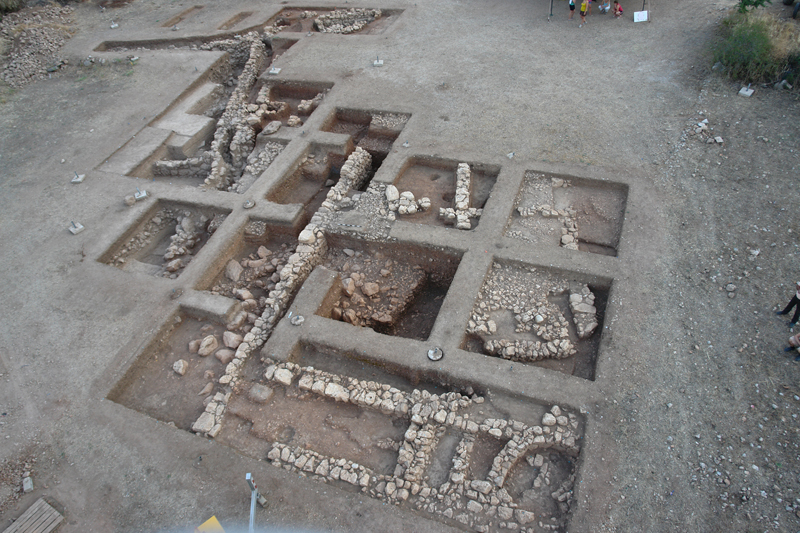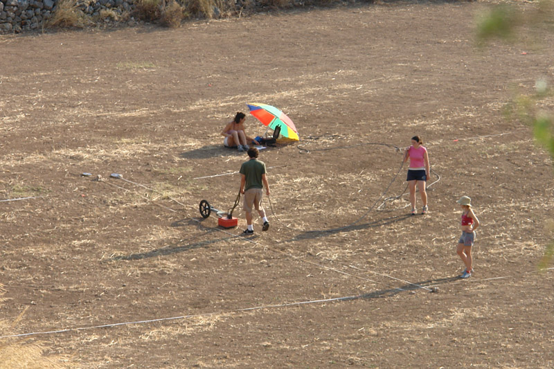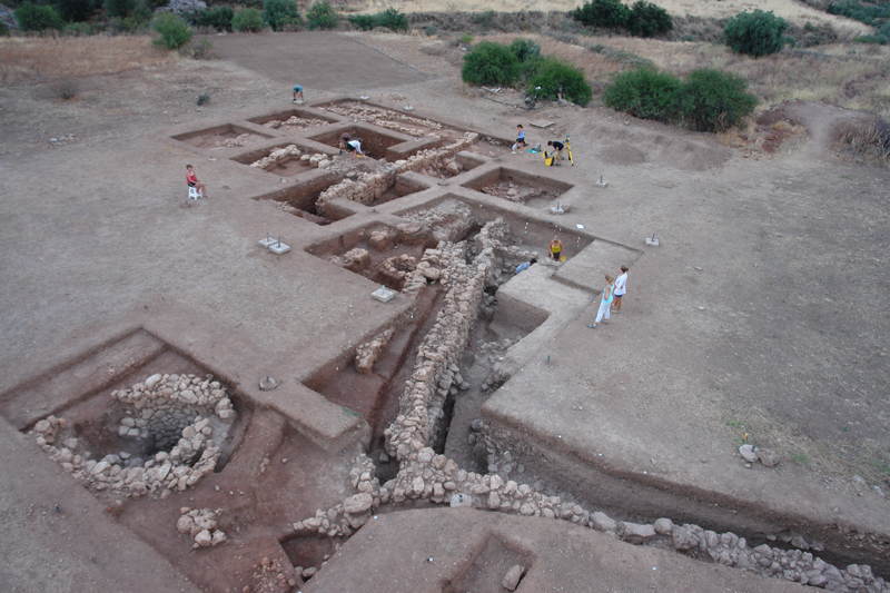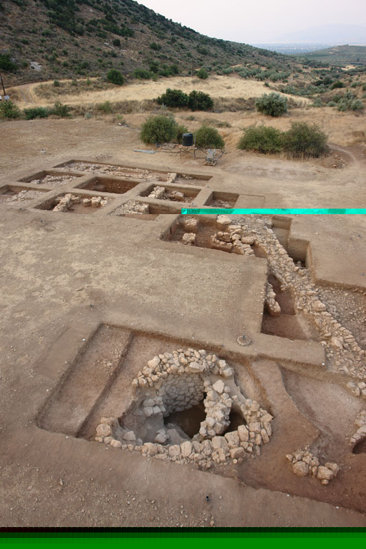 Recently, an extensive surface survey (1991-1993) and a systematic geophysical survey (2003-2009) combining ground-based remote-sensing methods, G.I.S., and aerial reconnaissance discovered, identified and mapped hundreds of visible and buried structures in a wide area around the citadel, including tombs, houses, buildings, guard towers, beacons, a network of roads and highways, bridges and dams, as well as an outer fortification wall with three gates. The preliminary survey data outline mainly two superimposed occupation levels, namely a small Geometric/Archaic settlement and an underlying, large Mycenaean town (ca. 30 hectares) consisting mainly of domestic units and commercial buildings, but also including larger structures potentially connected with palatial economy, bureaucracy and administration.