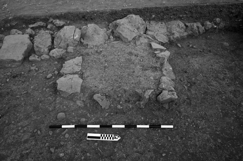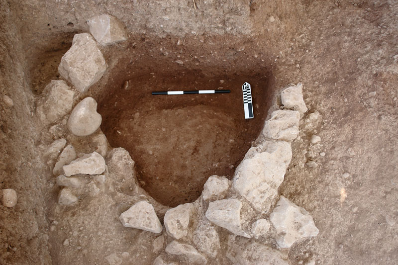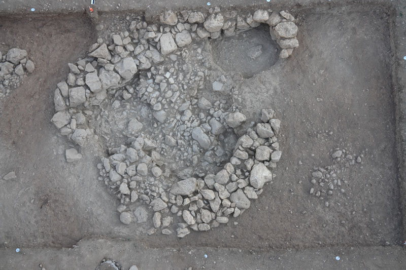 An open-air hearth encased by a two-course-high circular rubble wall was discovered west of the apsidal structure. The hearth was marked by strong fire traces and produced remains of charcoal and burnt animal bones. Scattered around the hearth were found carbonized organic remains (olive pits), Mycenaean figurines and sherds (including the spout of a stirrup jar), clay vase lids and corks, a small clay disc (possibly potter's wheel?), but also a few Middle Helladic (Minyan), Geometric and Archaic sherds (including a diagnostic 6 th -century-BC Corinthian sherd decorated with a panther and filling ornaments).