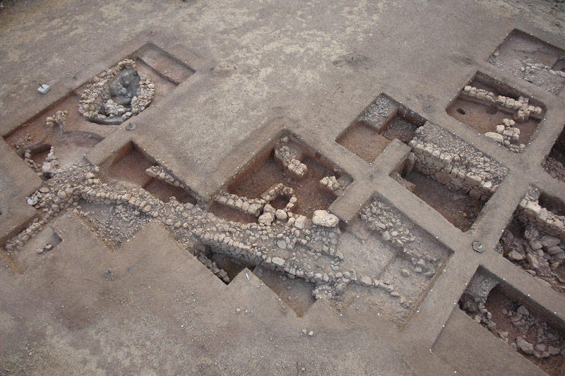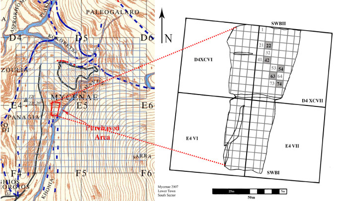 The excavation of the settlement focused initially on the South Sector, and more specifically on the western part of terraces I and II of the South-West Bank (SWB I, II), where four stremmata (1 acre) of the surveyed land were purchased in 2006 with funds from Dickinson College. In the topographical grid of Mycenae, the purchased land falls within grid-squares D4 and E4 (500×500m), each of which was divided into 50x50m grid-squares (numbered in Roman numerals I-C); each of those, in turn, was further sub-divided into 5x5m grid-squares (1-100), and finally into 1x1m grid-squares (e.g. D4-XCVIΙ-22-2a). The geodetic measurement and plotting of the topographical and archaeological grids was carried out by means of Total Station. All the field campaigns so far (2007-2011) have targeted the northern part of the purchased land (SWB II), where the intensive geophysical survey identified and located with remarkable precision substantial structures to a depth of -2.5m; these include houses, workshops, building complexes, and an outer fortification wall (5m thick) with at least two gates, one of which is framed by two gate towers and controls the main northbound highway (3m wide) which runs N–S (roughly parallel to the modern road) leading up to the citadel through the settlement. In general, architectural features and structures of the settlement at Mycenae emerge at the depth of only -0.10/0.15m. Their lay-out and spatial distribution reveal different orientation patterns of chronological significance: Mycenaean buildings follow a N-S orientation, parallel to the main northbound road to the citadel, whereas later structures appear to be oriented NW-SE . In particular, twenty-one 5×5m grid squares have been excavated so far (D4-XCVI-38, 39, 40 and D4-XCVIΙ-21, 22, 31, 41, 42, 43, 51, 52, 53, 54, 55, 62, 63, 64, 65, 73, 74, 75) .