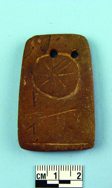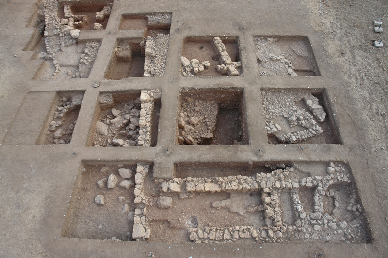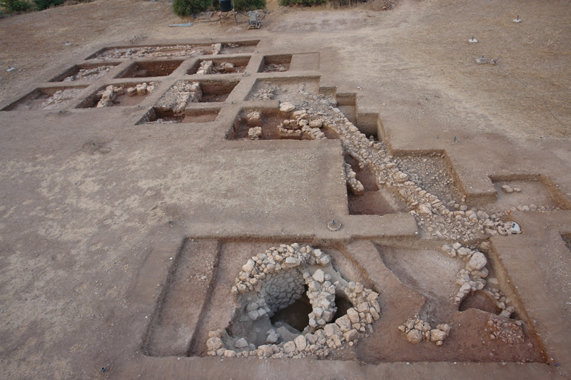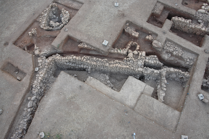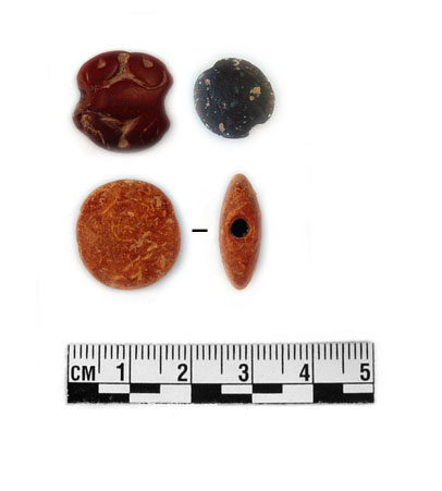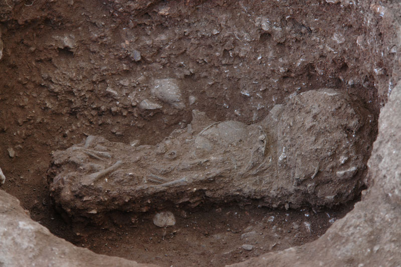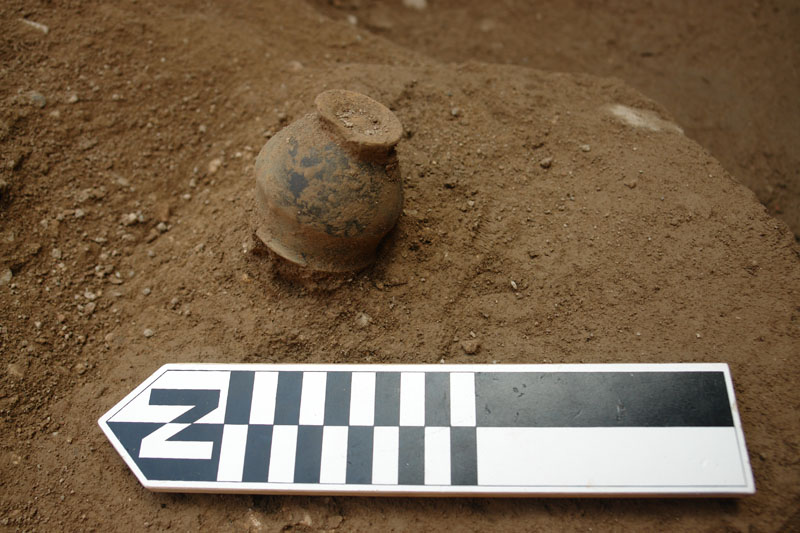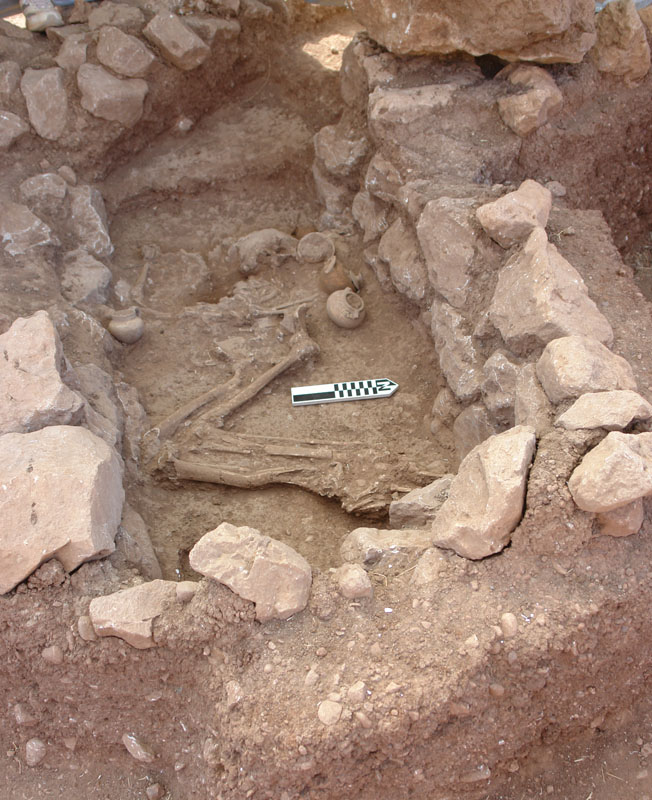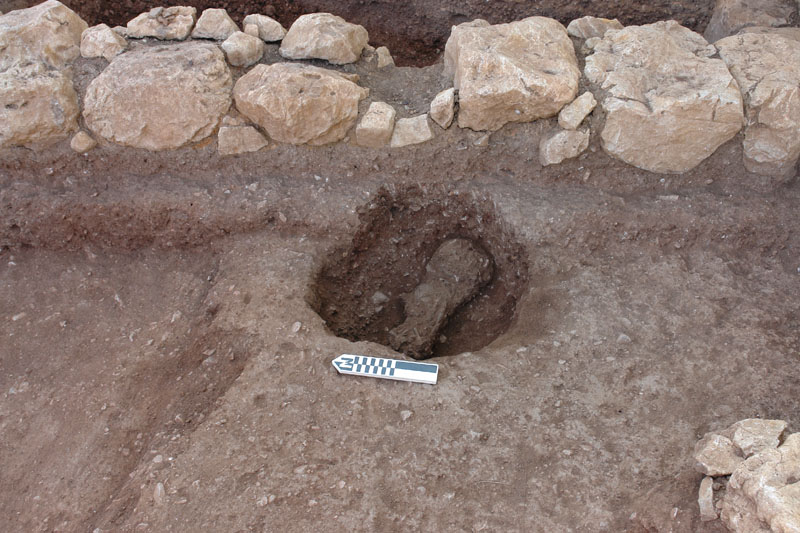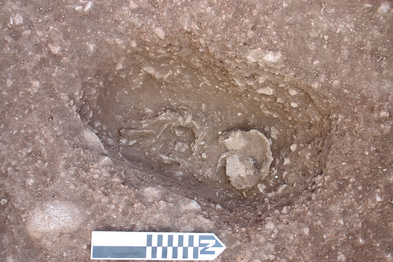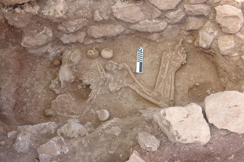 In the central sector a multi-room complex was discovered (D4-XCVII-54/55/64/65), consisting of at least three or four rooms which were founded upon the red fill with NW-SE orientation (Figs. 12, 18, 23, 29-32). The clay floors of these rooms, which are elevated by approximately 1m from the floors of the adjacent oblong building to the south, were found covered and sealed by a layer of cobbles, fallen stones, and roof tiles. The eastern rooms contained a shallow circular work pit and yielded figurines, a small bead, mixed pottery, and animal bones. The northernmost room was fully excavated (D4-XCVII-54) and produced two pit graves with children burials under the clay floor. The northern pit grave, which may have been originally covered with slabs (two of which were found vertically placed), contained the skeleton of an infant (1-2 years old). The child burial was furnished with four miniature faience beads of various colors and food (seed and organic remains and seed retrieved by flotation). The discovery of a small lump of plesia (insulating whitish mortar) from the clay floor inside the pit establishes that this pit grave postdates the construction of the floor, therefore being contemporary with the period of use of the overlying building. The eastern pit grave contained two infant skeletons (1-2 years old) and seed remains. The location of the pit abutting the foundation of the eastern wall of the room and the slightly raised placement of one of the skulls against it indicate that this pit follows and, therefore, postdates the wall, being contemporary with the period of use of the overlying building (Geometric).