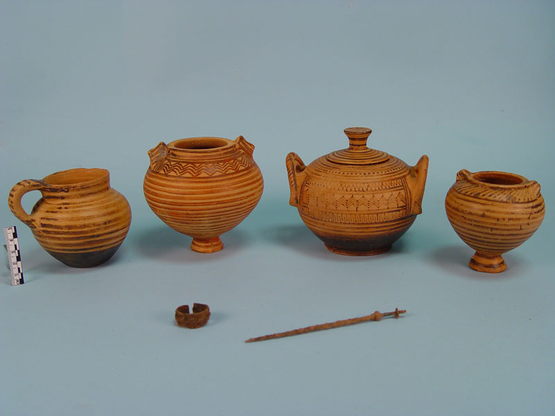 Attached to the eastern face of this wall was found a low, semi-circular or rectangular structure (0.85-1.12m×1.12-1.23m) which is made of packed cobbled fill encased within a two-course-high rubble wall (D4-XCVI Ι -42). At first, this structure was tentatively interpreted as a low, work platform, intended perhaps for food preparation, as indicated by its form, location, and related finds (a clay frying-pan, a pestle, burned animal bones, charcoal, and carbonized organic remains such as grains and seeds) which were discovered in close proximity to the platform. Further investigation, however, of this structure established that this rubble structure was deeper, cutting into the red fill (debris flow) which seals, protects, and separates the underlying Mycenaean stratum from later remains. The excavation of this structure revealed a rectangular, rubble-built cist grave (int. dim. 1.75-1.80m×0.75-0.95m) of E-W orientation, whose western end had been damaged and dismantled during the foundation of a superimposed later wall. The cist grave which was found practically undisturbed, contained a single adult burial interred in a contracted position, resting on its right side with the head oriented westwards and facing south. The articulated skeleton was well-furnished with an iron pin (found in situ on the right shoulder-blade), an iron ring (found in situ around a phalanx of the right hand), and five clay vases, four of which were carefully lined behind the back of the body (two decorated small footed jars with perforated lug-handles, a shattered, undecorated small pithoid vase, and a decorated pyxis with lid), while a fifth one (a decorated one-handled cup) was placed in front of the body and beside the right hand. All the vases but one were found intact and their undisturbed content was sampled for organic residue analysis. The cist grave is securely dated to the late 9 th century B.C. on the basis of Middle Geometric Argive pottery and jewelry found in its context, which also establishes a solid terminus ante quem for the construction and use of Wall B. It appears that the cist grave was backfilled right after the interment with the same soil that was dug out for its construction; that would explain the discovery of several Mycenaean sherds and fragments of Mycenaean figurines in the upper part of its fill. The geomagnetic trace of this grave on the geoprospection images is potentially diagnostic of other Geometric graves in the vicinity, where the south part of Geometric cemetery of Mycenae must have extended.