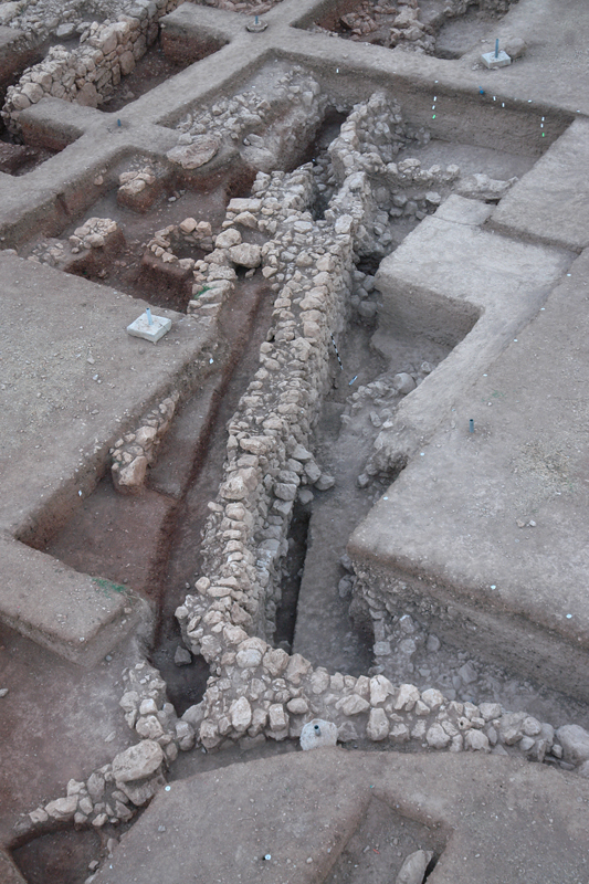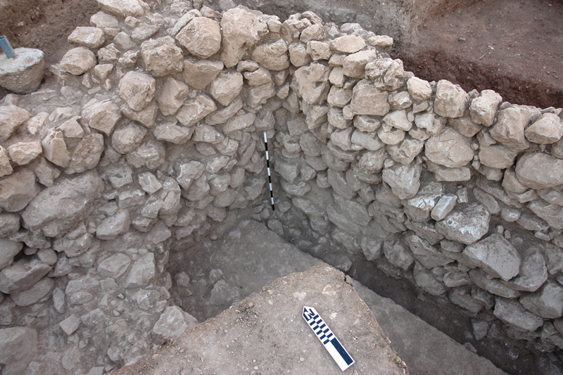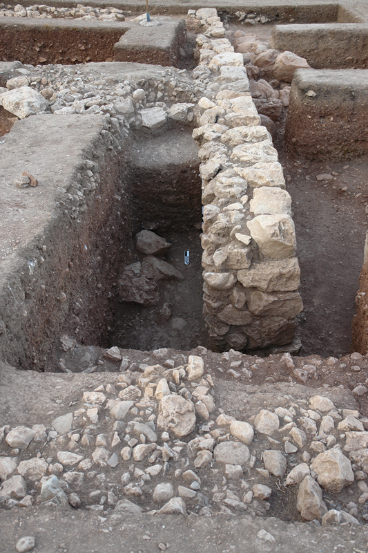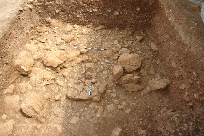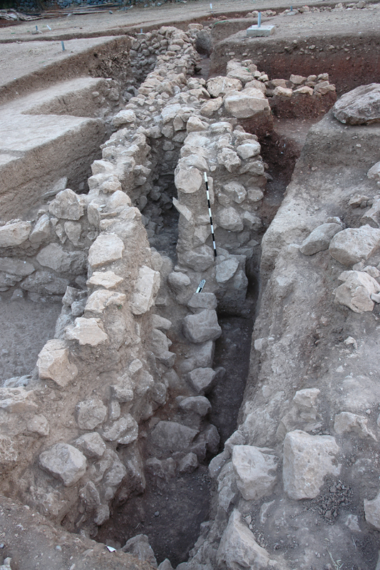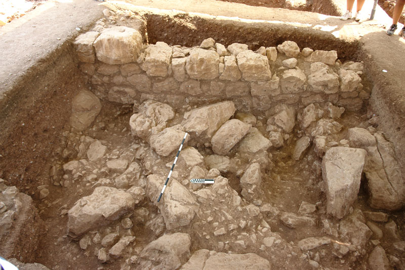 In the western sector of the excavated area (D4-XCVI-38/39/40; D4-XCVII-21/31/41/42/51/52/62), a long and solid wall (Wall B) runs SE-NW for some 20m before turning to the SW at a right angle to run for at least 12m, matching perfectly its trace on the geoprospection images. The westbound section of the wall was revealed to the depth of only three to four courses on its better preserved south face; nevertheless, the wall appears to continue deeper, as indicated by the depth of its fill and the sporadic use of large boulders in its lower courses. This wall may also be connected with the adjacent apsidal structure and the built hearth to the NE, if it does continue eastward, as suggested by the increased thickness at its corner and sporadic wall remains(?) on its projected course to the NE. The finds from the upper fill of the westbound wall are rather mixed, including Mycenaean and Geometric pottery, Mycenaean figurines, an Archaic phiale and figurine, stone tools, a lentoid seal stone bearing the relief image of a schematic female body, an inscribed roof tile, coins, stamped clay spools and lids, iron nails and chisel. The central section of Wall B survives to the height of 2.2m with nine courses on its better preserved western face and thickness that varies considerably (0.60-1m thick). The wall was built of medium-sized field stones and founded upon the reddish-brown fill (water flow) but below the horizon of the red fill (debris flow) which it retains on its eastern side. In the middle of its surviving length the wall forms a well-built eastward indentation on which a Middle Geometric cist grave abuts.